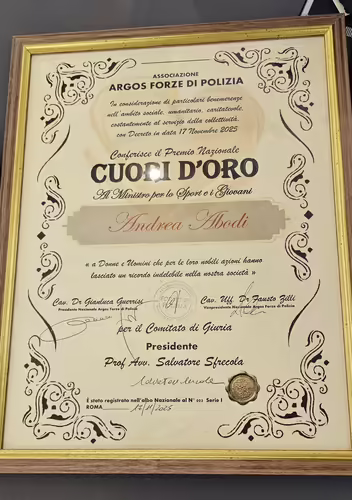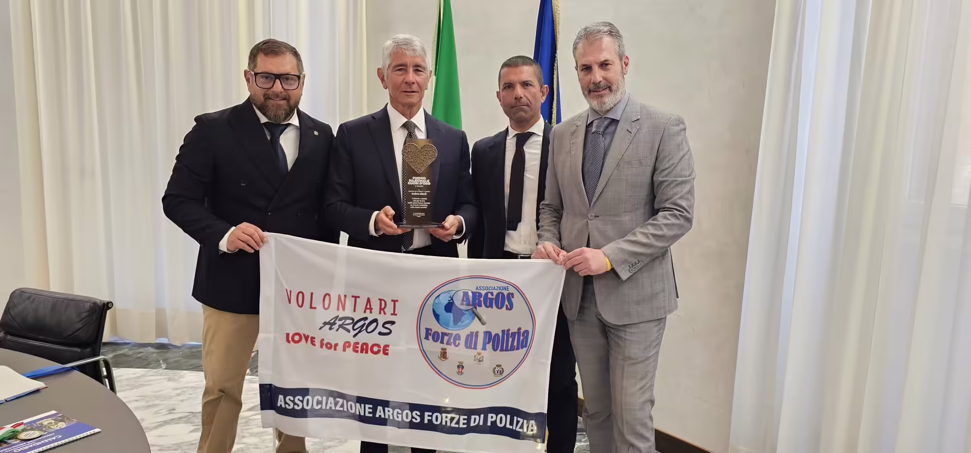 La delegazione di presidenza dell’Associazione ARGOS Forze di Polizia con il presidente nazionale Gianluca Guerrisi, il vicepresidente Fausto Zilli si sono recati presso la Presidenza del Consiglio dei Ministri presso il Ministero dello Sport e i Giovani per la consegna della statua del premio Nazionale Cuori D’oro.