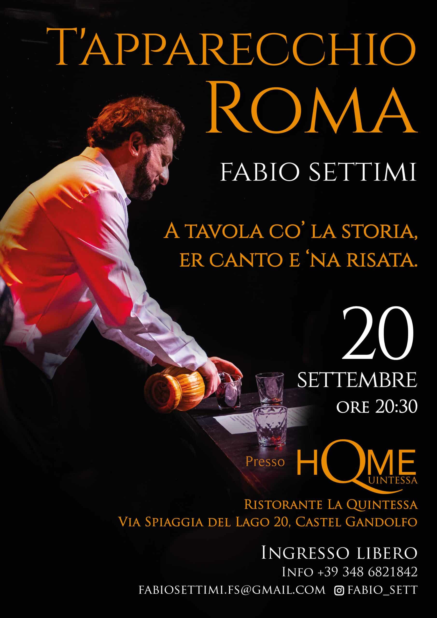 A cena con Aldo Fabrizi, Nino Manfredi, Gigi Proietti, Enrico Montesano ed i più grandi artisti della romanità. L’appuntamento è per sabato 20 settembre a partire dalle 20:30 nella suggestiva cornice di Quintessa Home, sulle rive del lago Albano di Castel Gandolfo.